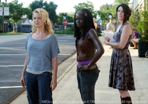 The next morning, the Governor and Milton join Andrea and Michonne for breakfast. Making charming conversation, the Governor extols the virtues of Woodbury and its people. Although Andrea chats away freely, Michonne remains mostly silent. In a post-breakfast stroll, the two women lay it on the line; Andrea wants to stay another “day or two” while Michonne wants out.
