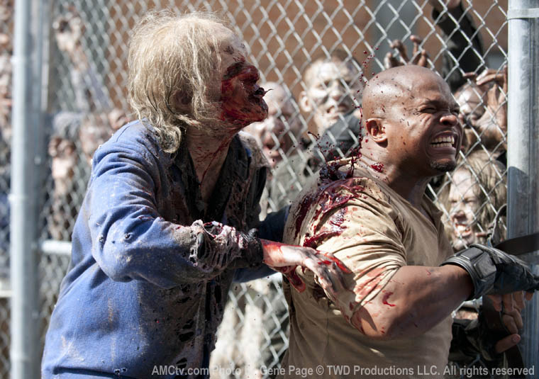 Deep in the prison, T-Dog refuses Carol’s (Melissa McBride) help with his bitten shoulder and insists on getting Carol back safely to the cell block. At the laundry door, in a final sacrificial act, T-Dog throws himself at some walkers, creating a diversion that enables Carol to run to safety. T-Dog screams as the walkers rip him to pieces.