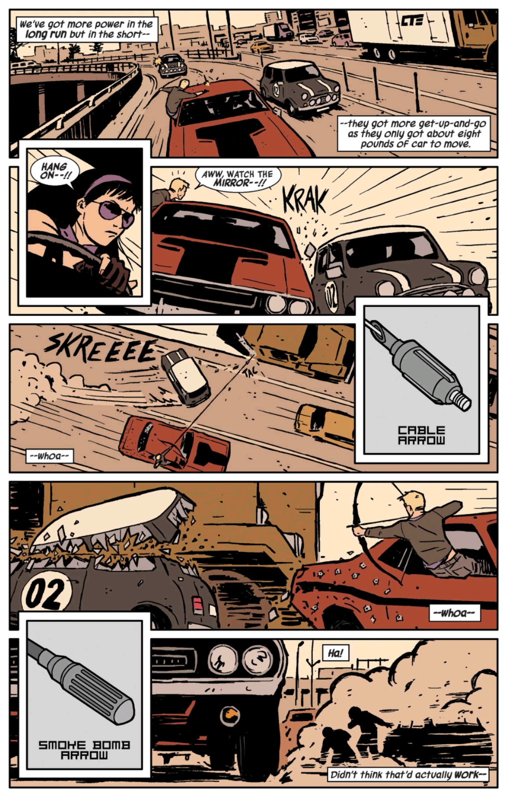 One of the more memorable fight scenes in the series was in issue #3, called “Beating the Odds”, and involved the two in a frantic car chase as they fled the Track Suit Mafia. Anyone who saw the recent preview clip of Hawkeye during the Disney+ Day event could tell that the car chase shown in the clip was inspired by the issue.